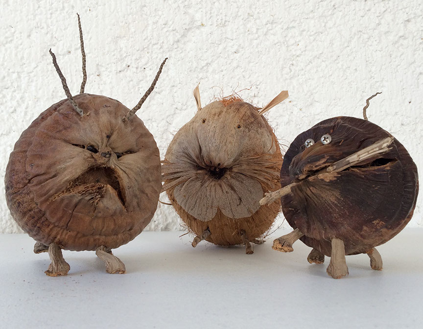 Cocopets, una artesanía con cero costo? económico o ecológico? utilizando los desechos encontrados debajo de palmeras de la costa maya y una navaja como herramienta, fueron creados los Cocopets, criaturas mayas representando aluches, guardianes contra las malas vibras, construidas completamente de materiales vegetales de desecho, ... una posible fuente de ingreso para artesanos de bajos recursos o muy codos...